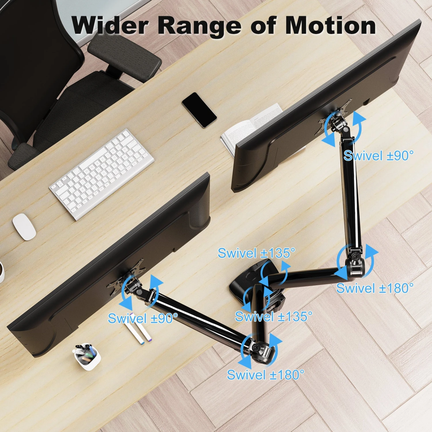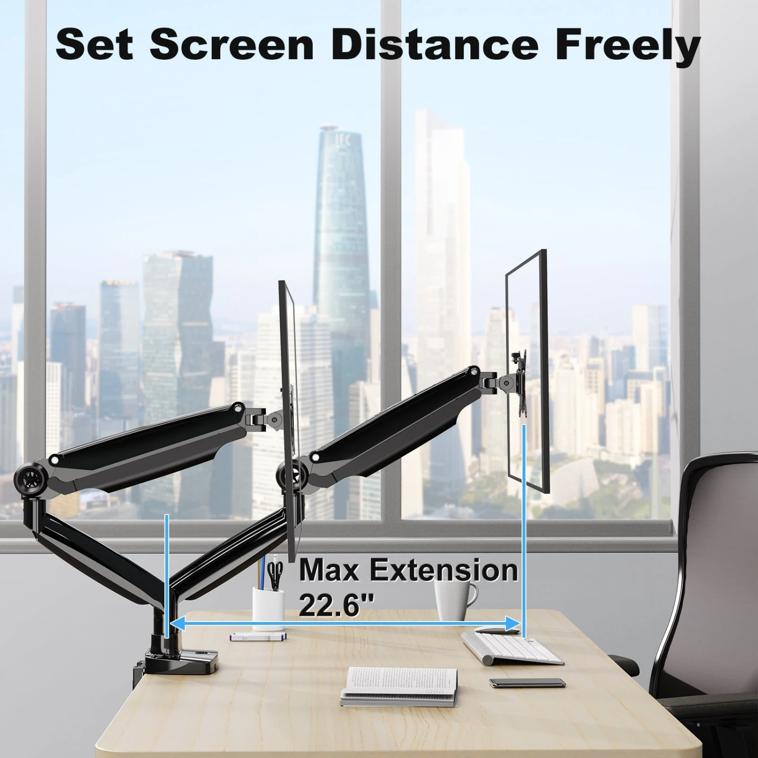 <Full Range Motion & Increase Comfort>Offer a wider range of movement, the computer monitor stand allows 2 screen to tilt up 90°/down 45°, swivel 180°, and rotate 360° from landscape to portrait. The arm can extend up to 20.7″ long, rise up to 19.7″ in height. Easily find an optimal ergonomic posture, relieve strain on spine, neck, and shoulders.
