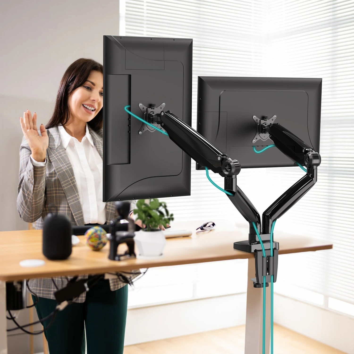 <Integrated Cable Management & Longer Life>Concealing cables through detachable cable cover on double arm, hide sore eyes wires clutter, keep organized, improve office comfort. Premium gas spring after over 20,000 exercise tests, provide longer life, makes arm move easier and smoother.