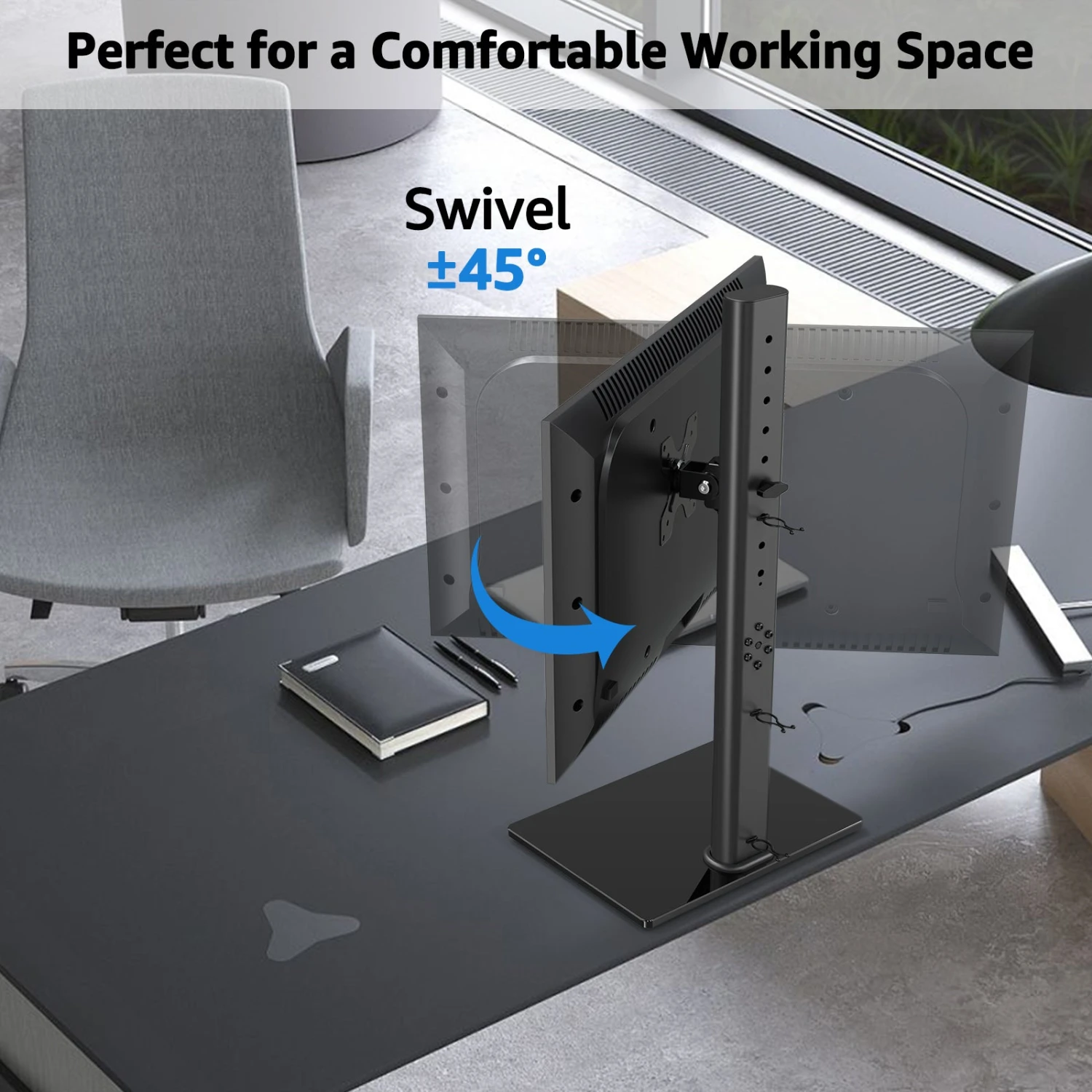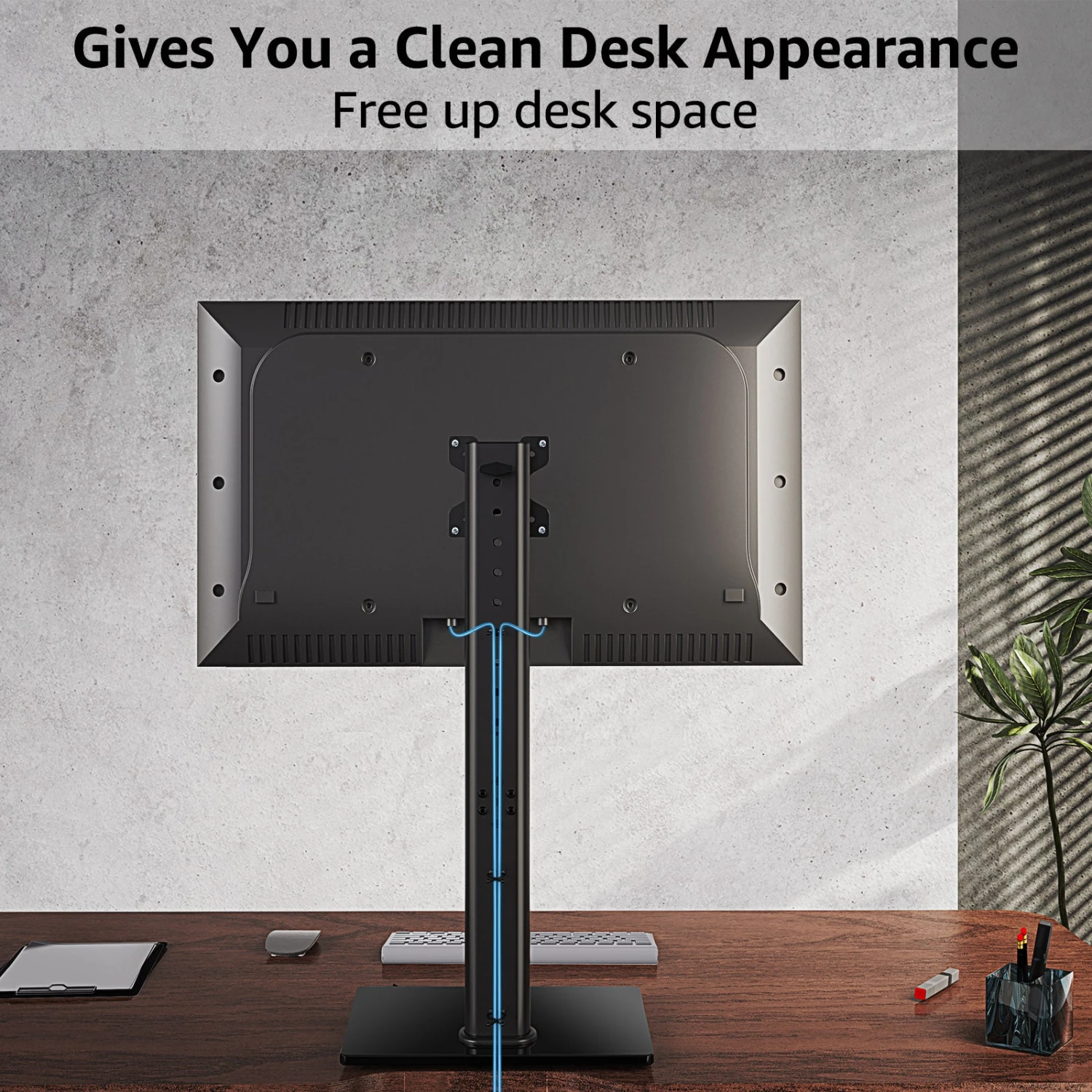 <Wide Range of Monitor>With 2 support pillars for higher height adjustment and more space for larger screen, the monitor stand allows you to freely place the monitor vertically. This single monitor stand can hold flat or curved screens ranging in size from 17-42 inch and weighing up to 33 lbs. The desktop screen mount comes with 75×75 or 100×100 mm VESA-compliant holes on the back and removable cable management clips for versatility to meet your needs.